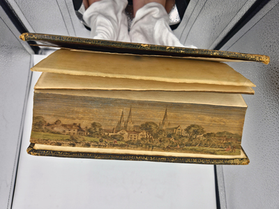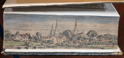 Found within the Special Collections Department’s non-circulating book stacks is a special holding. It is entitled, “The Book of common prayer, and administration of the sacraments, and other rites and ceremonies of the church, according to the use of the Church of England: together with the Psalter or Psalms of David, pointed as they are to be sung or said in churches,” by the Church of England. This 688-page, 263-year-old tome contains a hidden jewel – a fore-edge painting. A fore-edge painting is a painted decoration on the fore-edges of the leaves of a book. The painting is barely visible and has been covered in gold, gilded edging. Once the book is fanned or tilted at an edge, the arresting illustration is evident to the eye. The illustration seen here shows a landscape setting with a cathedral, village and numerous people. Hand-written inside the book is, “Lichfield Cathedral.” Upon farther research, the cathedral depicted in the fore-edge painting is strikingly similar to the Lichfield Cathedral, a Church of England cathedral in the city of Lichfield, England.