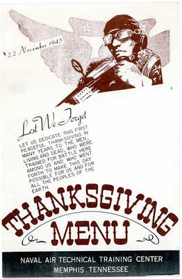 To kick off the upcoming holiday season, this November’s Item of the Month from the Special Collections Department celebrates the festivities that surrounded the Thanksgiving holiday in 1945. This menu is from the Naval Air Technical Training Center here in Memphis, TN. The cover features an illustration of a Naval Airman in action and states, “Lest We Forget...Let us dedicate this first peaceful Thanksgiving in many years to the men, living and dead, who were trained for battle here among us and who went forth to make this day possible for us and for all the peoples of the earth.” This was a pivotal holiday season as it was the first peacetime Thanksgiving in over four years. Americans were grappling with a mixture of emotions – sorrow and joy, gratitude and mourning, reflection and optimism. Having the opportunity to spend tranquil time with family and friends over a bountiful, not-rationed meal must have been a treasured time for many.