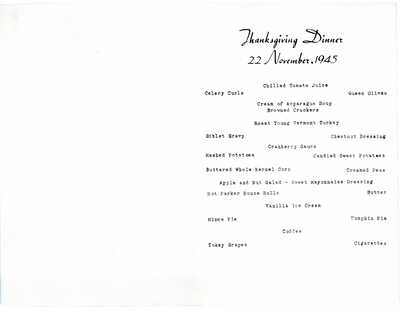 Of note is the line-up of courses and the food selections at hand for those attending this Thanksgiving dinner. There are many traditional Thanksgiving foods found in the menu like turkey, gravy, mashed potatoes, corn, cranberry sauce, and rolls; and to top it all off, cigarettes! Not much is known about the entertainment, if any, that was provided at dinner or what time the dinner started and ended; however, it can be presumed that many people at the dinner enjoyed themselves that evening. One can picture them basking in the company of fellow servicemen, servicewomen, and their families, while quietly making plans for the future.