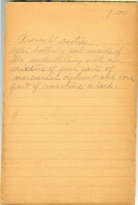 The recipe states, "After bathing rub inside of the underclothing with a mixture of four parts of mercurial ointment and one part of vaseline or lard."