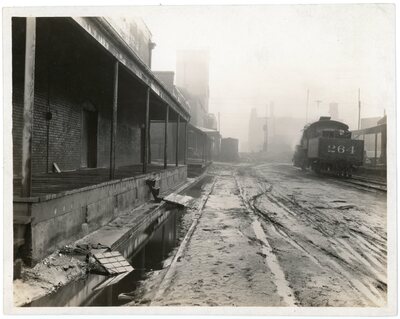 A muddy street, possibly Front Street, on the Mississippi River front in Memphis, Tennessee, after flooding, December 23, 1926. Photographer: W.G. Keller, Poland Photographers.