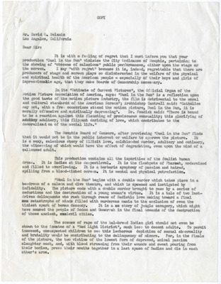Carbon copy of an undated (circa 1946) letter from Lloyd T. Binford, Chairman of the Memphis Board of Censors, to David O. Selznick, producer and writer of the film "Duel in the Sun" in Los Angeles, California, explaining the decision not to allow the film to be shown in Memphis, Tennessee. Other documents, also undated, are the draft and officially released decisions of the Board of Censors.