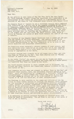 Letter and article (copies) submitted by Lloyd T. Binford, President of the Memphis Board of Censors, Memphis, Tennessee, to Collier’s Magazine, New York, May 30, 1950. It was sent in response to a critical article in Collier’s on May 6, 1950, titled “You Can’t See That Movie”.