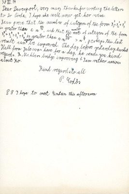 Correspondence from Paul Erdős to Harold Davenport, 1938 November 14.
