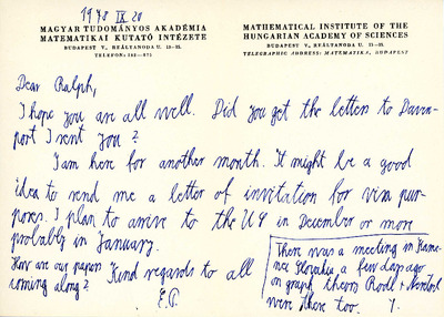 Correspondence from Paul Erdős to Ralph Faudree, 1980 November 13. Additional note, Plummers.