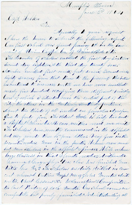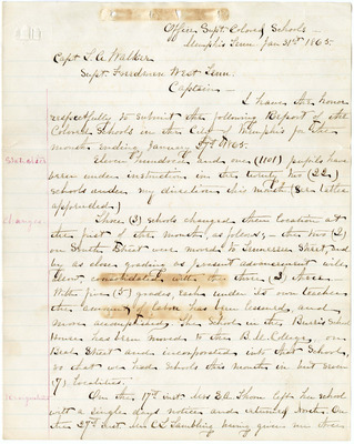 Correspondence to Captain T. A. Walker, Superintendent of the Freedmen's Bureau West Tennessee, Memphis, TN, from L. H. Cobb, the Superintendent of Colored Schools, Memphis, TN, 1865 January 31. Cobb wrote a report of the Colored Schools of Memphis for the month ending January 27, 1865. He provides details and updates on enrollment, location changes, punctuality of the students, "rules wanted," "embarrassments," tuition, causes of discrepancies, objections, and potential plans for the schools.
