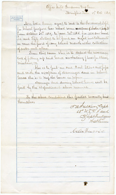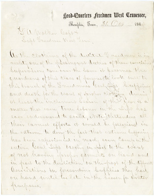 Correspondence to Captain T. A. Walker, Superintendent of the Freedmen's Bureau West Tennessee, Memphis, TN, from R. D. Bird Sr., Superintendent of Industrial Schools District, Memphis, TN, 1864 October 31. Bird details some suggestions and a report for the month of October 1864. Bird stated, "I have the honor to report that during the short time I have been acting without instructions under Special Orders from you, I have had manufactured out of clothing turned over by hospitals nearly (200) two hundred garments mostly for boy and girls..."