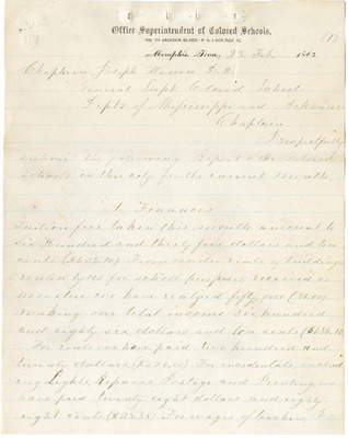 Correspondence to Chaplain Joseph Warren, General Superintendent of Colored Schools, Departments of Mississippi and Arkansas, from L. H. Cobb, Superintendent of Colored Schools, Memphis, TN, 1865 February 25. "Chaplain respectfully submit the following report of the Colored Schools in this city for the current month." This report details finances, efficiency of teachers, missionaries, changes, explanations, wants, suggestions, statistics, and a list of teachers.