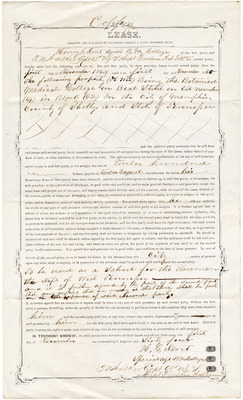 A property lease document detailing how the Freedmen of the Department of West Tennessee will lease "the following property...Being the Botanical Medical College on Beale Street on lot number (14) in Block (62) In the City of Memphis, County of Shelby, and State of Tennessee...To be used as a school for the Freedmen of the Department of West Tennessee..." The first party was Henry G. Dent, Agent of Botanical Medical College and the second party was Captain T. A. Walker, Superintendent of Freedmen West Tennessee. The second party agreed to pay the first party $1200.00 payable in twelve equal installments from 1864 November 1 to 1865 November 1. The agreement was signed on 1864 November 1.
