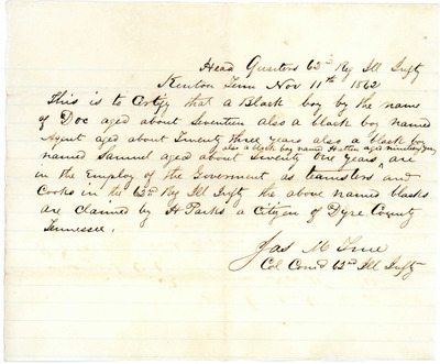 Requisition receipt issued during the Civil War to Hamilton Parks of Dyer County, Tennessee, by Colonel James Milton True of the 62nd Regiment, Illinois Infantry, from their headquarters at Kenton, Tennessee, dated November 11, 1862. Certified that the following four enslaved men have been employed by the regiment as cooks and teamsters: Doc aged about 17, Agent aged about 23, Samuel aged about 71, and Hatten aged about 19.