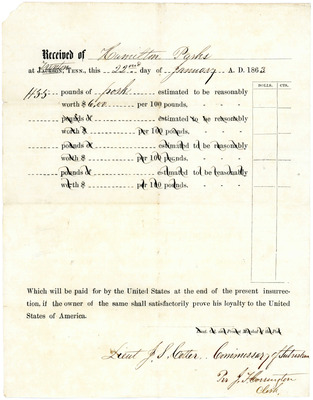Requisition receipt issued during the Civil War to Hamilton Parks by Lieutenant J.S. Cotter, Commissary of Subsistence, at Trenton, Tennessee, on January 22, 1863, for 1155 pounds of pork valued at $6.00 per 100 pounds. The document states: "Which will be paid for the United States at the end of the present insurrection, if the owner of the same shall satisfactorily prove his loyalty to the United States of America."
