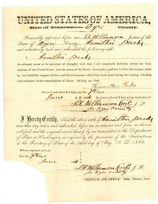 Amnesty oath taken by Hamilton Parks before J.F. Williamson, Justice of the Peace of Dyer County, Tennessee, on June 7, 1866, in which he agrees to defend the constitution and the union of the United States, and to abide by the laws regarding the emancipation of slaves.