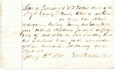 Indenture issued by W.M. Watkins, Clerk of Dyer County Court, Tennessee, declaring that Blount, Margaret, Anthony, Samy and Fanne Parks, formerly enslaved children owned by Hamilton Parks, are indentured to him for remainder of their minority, dated January 3, 1870.