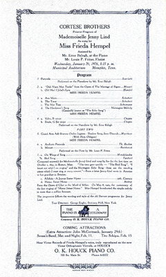 Program for a performance by Frieda Hempel of opera pieces associated with famed 19th century soprano Jenny Lind at the Auditorium, Memphis, Tennessee, on January 20, 1926. The concert was promoted by the Cortese Brothers.