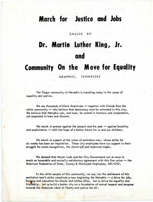 Flier for the March for Justice and Jobs that took place on March 28, 1968, during the Memphis sanitation workers' strike, Memphis, Tennessee. The march was led by Dr. Martin Luther King, Jr. and the Community on the Move for Equality and was meant to be a major push by the Black community to break the deadlock in the strike.