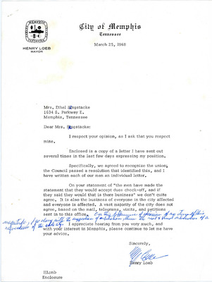 Letter: Memphis Mayor Henry Loeb to Ethel Sengstacke, 1968