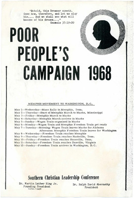 Program of "the service of memorial and dedication for Dr. Martin Luther King, Jr.", at the Lorraine Motel, Memphis, Tennessee, held on May 2, 1968. The service, led by Coretta Scott King and Dr. Ralph Abernathy, launched the Poor People's Campaign.