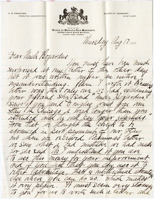 In the letter, Fred discusses how his baby son, Bayard, is recovering from scarlet fever. He mentions that they have not seen "Fay or Nora for some time as the Doctor prohibits my going there, on account of scarlet fever or their coming here, on account of measles. The last time I saw any of them, I talked to Fay...outside of the house & kisses 'seen' through the window glass."