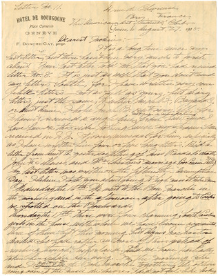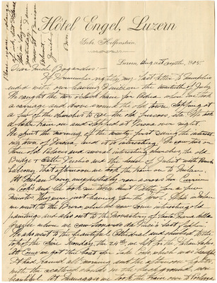 She speaks of how the hotel proprietor in Lugano tried to charge them more for their stay beyond the agreed upon amount. The police were called and "it ended in our getting the better of the hotel proprietor by 20 francs, catching our 11.14 a.m. train for Zurich, which he had been trying to make us miss, and leaving in good spirits and with flying colors. I reckon it will be a cold day in July before he trys to tackle American women again. He was hoping mad, but would do nothing, for we had him in our power. We found some charming Americans on the train, which made our trip pass pleasantly & then we were going through beautiful country."