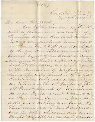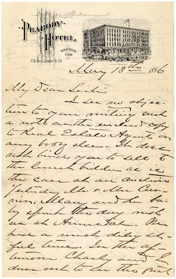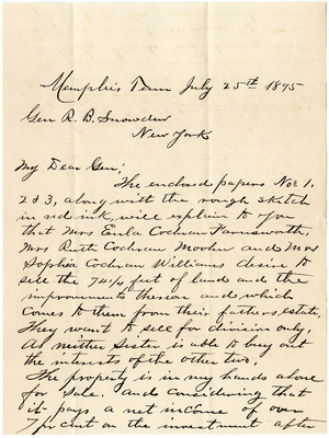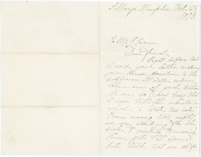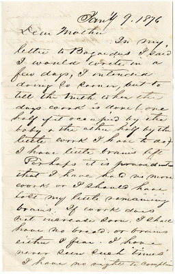 Correspondence from Fred Cairns (1820-1879) to "Mother," 1876 January 9. Fred was married to R.B. Snowden's sister, Mary Jay (1846-1930). This letter is addressed to "Mother" which could mean Fred's mother, but based on the context of the letter, could also be Mary Jay's mother and Fred's mother-in-law, Aspasia Snowden (1808-1885). In the letter, he states that he told R.B. "Bogardus" that he would write her in a few days and also says that Mr. Cairns is recovering from pneumonia and this could be a reference to his own mother.