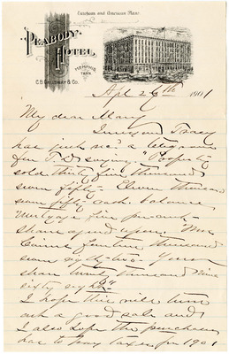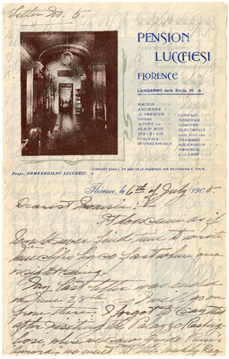 Correspondence to Mary Jay Snowden Cairns from her daughter, Elizabeth Walker Cairns, 1905 July 6. Elizabeth was writing from Florence, Italy. She details her activities including attending the opera and hearing "La Traviata," seeing St. Peter's Cathedral, taking drives in the Gianicolo gardens, describing the churches and cathedrals they have toured, and listing the artwork and sculptures she has viewed.