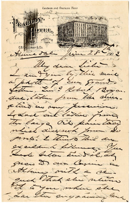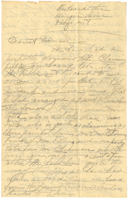 Annie is updating her sister, Imogene, about her European travels. "Went to Baker's musical store with Mrs. McCrackan(?) - a charming little lady who is staying at our Pension, and who takes special interest in us. We know her so well & like her so much now - The musical store was so fascinating that we have visited it frequently since...Saturday evening we went with a large party from our Pension to the Exhibition...We were greatly amused with the moving photographs - The moving room made me sick at my stomach...We walked along the lake until we arrived at Cologny where we saw Byron's home...We spent the morning at the Exhibition. It is something like the Chicago Fair only on a very small scale. The display of watches is very fine. The Swiss village is perfect - an ideal village...Sad to relate we were not cheered by any fireworks. It seemed strange not to have then on the fourth...We have jolly old times with the Princess. She is very charming, intelligent and lovely to us. She & her mother speak nearly every language...I forgot to mention seeing the imposing Castle of Chillon when we were making the tour of the lake."