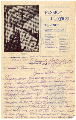 Correspondence to Mary Jay Snowden Cairns from her daughter, Elizabeth Walker Cairns, 1905 July 30. Elizabeth was writing to her mother from Zurich, Switzerland. She updates her mother on her Italian adventures, leaving Italy via boat and train, and staying in Lugano, Switzerland before traveling to Zurich, Switzerland.