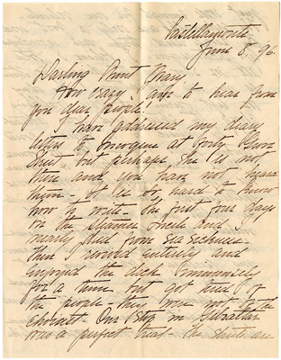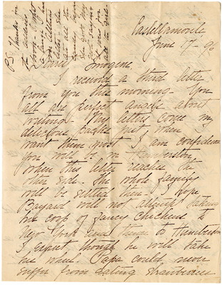 Correspondence to Mary Snowden Cairns from her niece, Annie Brinkley Snowden, 1896 June 8. Annie was writing to her aunt from Castellamonte, Italy. She was traveling in Europe with her cousin, Mabel Brinkley.