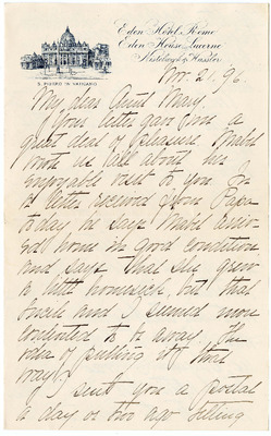 Correspondence to Mary Snowden Cairns from her niece, Annie Brinkley Snowden, 1896 November 21. Annie was writing to her aunt from Rome, Italy. She was traveling in Europe with her cousin, Mabel Brinkley.