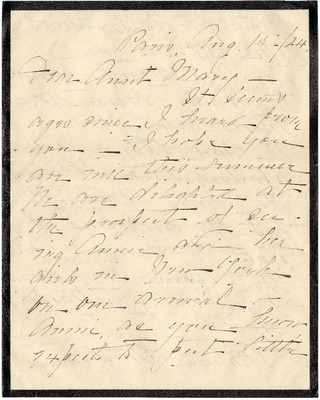 "I hope Uncle B. isn't very ill, for I haven't received a single ___, not even newspapers, from him since I have been on this side. Nothing since my ___ letter received in N. J. It is very unusual for him, especially as I have written him four or five long letters. Rec'd a letter from Aunt A. yesterday telling of Miss Raudal's death, John F.'s illness, and Wm. Overton's marriage....the others going over to the Musee du Louvre. I did not feel like looking at old pictures. In the afternoon we went to Sainte-Chapelle, and afterwards went to the Magasins due Louvre...We caught the train to Versailles. Walked through the gardens, went through the Grand & Petit Trianon & through the stables where the royal coaches are kept and saw Marie Antoinette's diary. After lunch we went through the Palais or Chateau de Versailles...I hear that it is very cold in N. J. It is also cold in Paris, but we are glad of it, after the awful heat we had in Italy. I hope it will get cold in New Orleans and stop the fever...I hope John H. is proved only to be malaria and not typhoid. We head for Loudoun on Saturday. Don't send any letters to me after the twenty-third of September."
