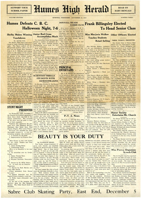 Vol. VIV, No. 3 of the "Mustang Roundup" published by the students of East High School in Memphis, Tennessee, on November 18, 1966. Page 2 includes a photograph of future actress Cybill Shepherd on her way to Dallas to compete in the Miss Teenage America pageant. East High School opened for grades 1-10 in 1946 on the corner of Poplar and Holmes. Grades 11 and 12 were added by 1950. The elementary school closed in 1985 and the school became a high school for grades 9-12 in 2008.