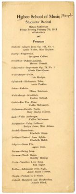 Program for a student recital of the Higbee School of Music, Memphis, Tennessee, at the Higbee Auditorium on February 7, 1913.