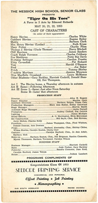 Program for the performance of "Tiger on His Toes" by the senior class of Messick High School, Memphis, Tennessee, on May 20-22, 1953.