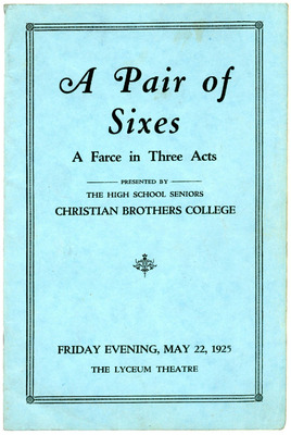 Program of the play "A Pair of Sixes" performed by the high school seniors of Christian Brothers College, Memphis, Tennessee, at the Lyceum Theatre on May 22, 1925. Includes photographs of the cast, boosters club and football team.