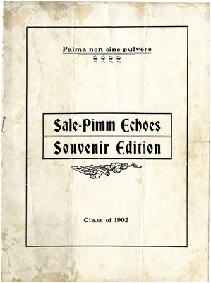 Souvenir edition of the "Sale-Pimm Echoes", the school paper of the Sale-Pimm Institute, 337 Adams Avenue, Memphis, Tennessee, published by the class of 1902. The principals of the girls' school were Mrs. Annie C. Sale and Miss Mary E. Pimm.