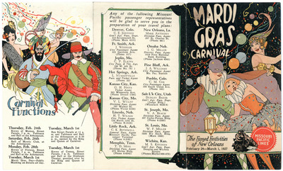 Advertising pamphlet from Missouri Pacific Lines railroad promoting travel to the Mardi Gras Carnival in New Orleans, Louisiana, in 1927.