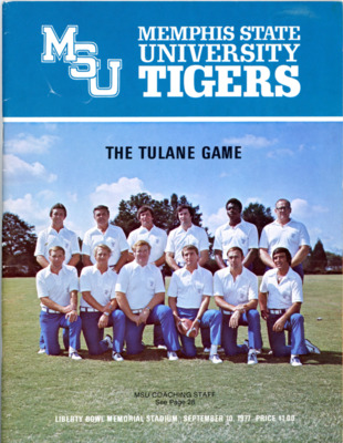 Program for the football game between the Memphis State College Tigers and the University of Mississippi Rebels played at Crump Stadium, Memphis, Tennessee, on September 21, 1951. The Tigers lost the game 0-32.